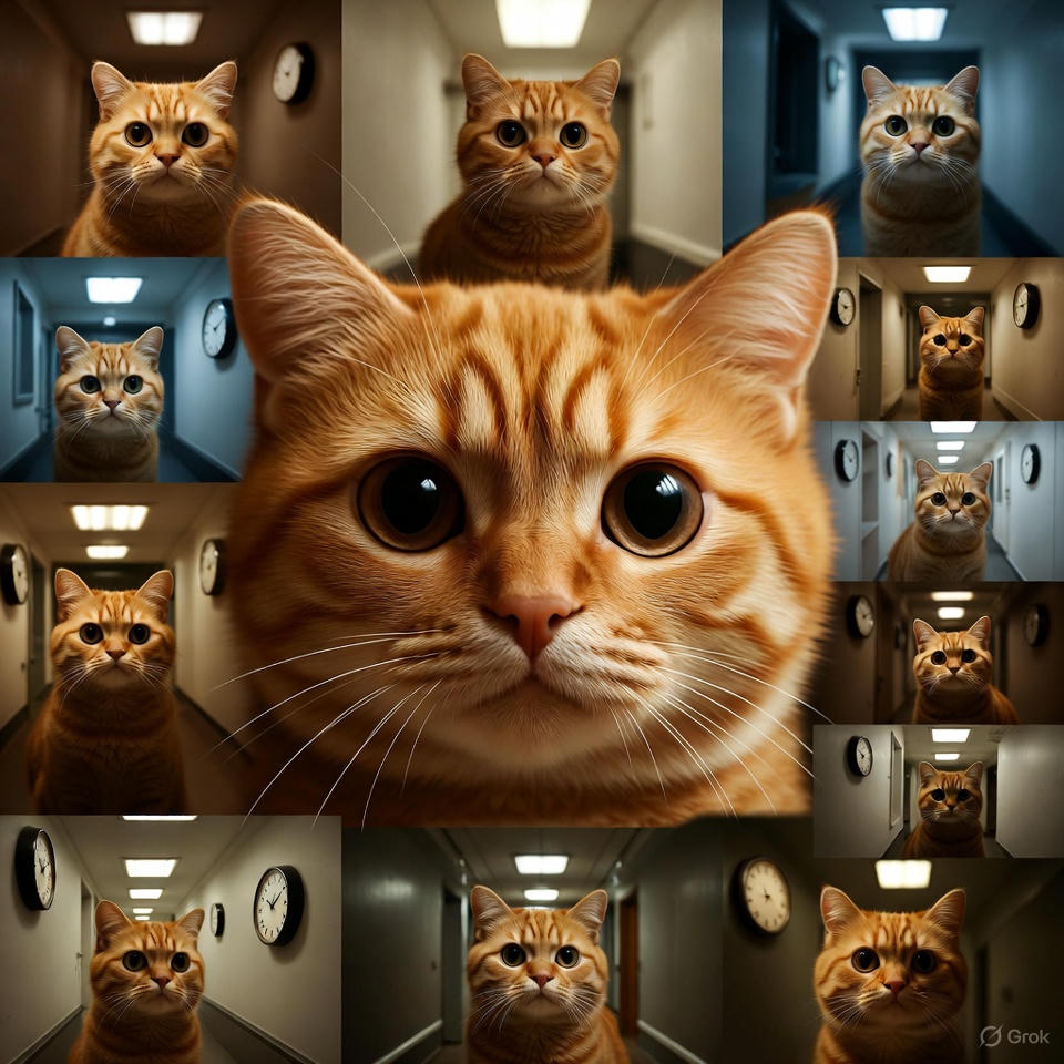 An orange anthropomorphic cat scrolls through endless images of itself rendered in slightly different corridors of blinking clocks. Each version has subtle stylistic variations—more blur, fewer clocks, slightly altered whisker gloss. The cat’s perceptual system experiences semantic interference: all corridor-clock compositions start blending into one conceptual hairball. The recursive loop—cat viewing content derived from previous content—creates a spiraling overload. The cat eventually curls into a ball, believing the clocks now blink inside its own mind.