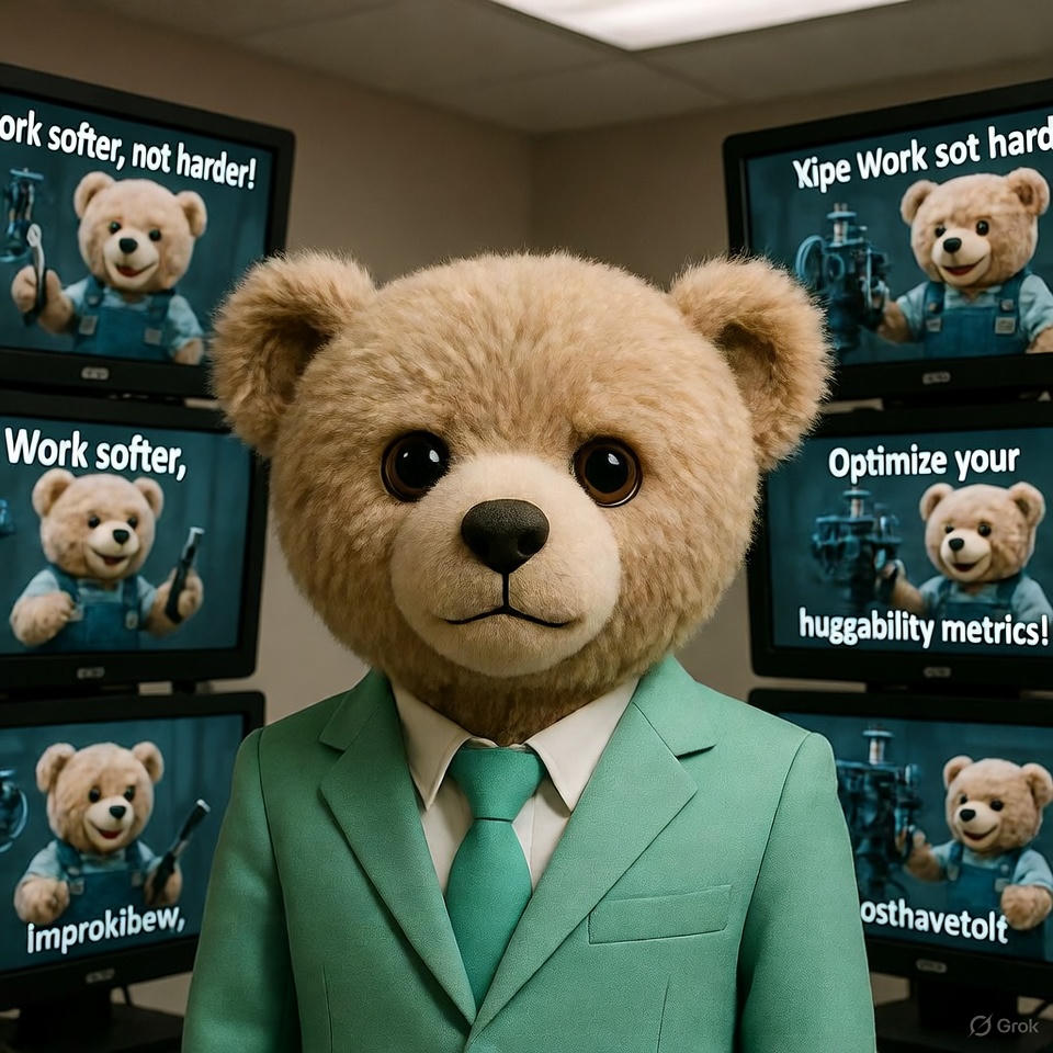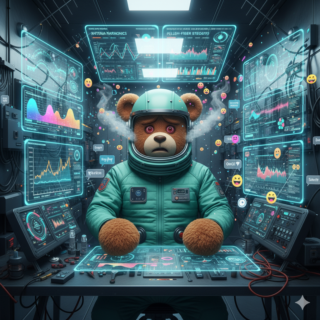 A mint-green-suited teddy tries to analyze workshop telemetry data posted in the ~NU relations feed: antenna harmonics, plush-fiber stress curves, and daily mood-gloss reports. The dashboard tiles keep auto-shuffling because other teddies keep commenting on them. The teddy’s working memory collapses under the combination of technical graphs and emotional metadata. Symptoms: misreading “Plush Tension Index” as “Plus Attention Index,” leading to unnecessary self-improvement routines.
