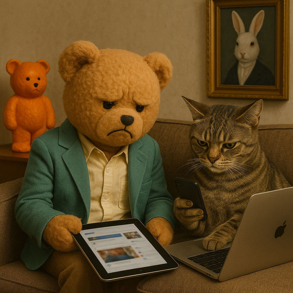 Across these examples, the mechanism is clear: recursive feeds compress, blend, and multiply demands on attention. Teddies attempt to troubleshoot their own emotional ergonomics; cats try to process infinite variations of themselves within their own media loop. The result—whether plush confusion or feline existential blinking—mirrors real cognitive overload in human digital environments.