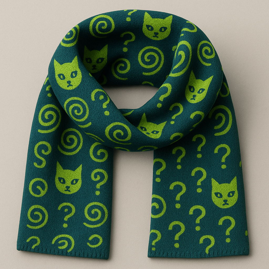 A thermally reactive scarf printed with ~NU’s famous CAT glyphs, which change form based on ambient emotional weather. In bright moods, it curls into spirals. In tension zones, it warps into floating question marks. Unironically banned in at least three debate clubs.
